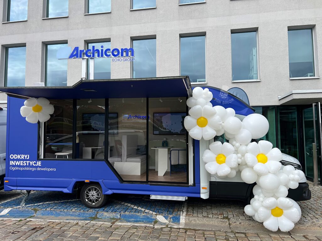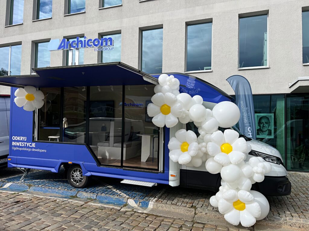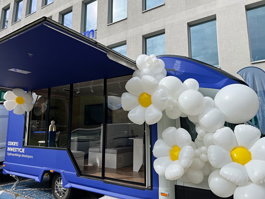 We wrześniu mieliśmy przyjemność zrealizować dekorację balonową dla jednego z czołowych deweloperów we Wrocławiu – firmy Archicom. W ramach firmowego eventu przygotowano mobilne biuro sprzedaży, którego elementem wyróżniającym była specjalna, tematyczna oprawa wizualna. Naszym zadaniem było stworzenie lekkiej, przyciągającej uwagę dekoracji, która wpisze się w motyw „FLOWER POWER” oraz w stylistykę wydarzenia. Projekt obejmował dekorację samochodu pełniącego funkcję mobilnego punktu, dlatego kompozycja musiała być jednocześnie estetyczna, stabilna i funkcjonalna w użytkowaniu.