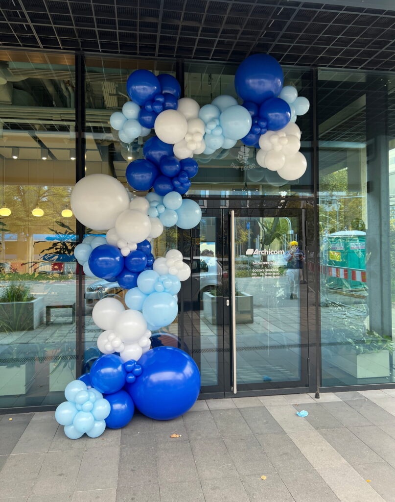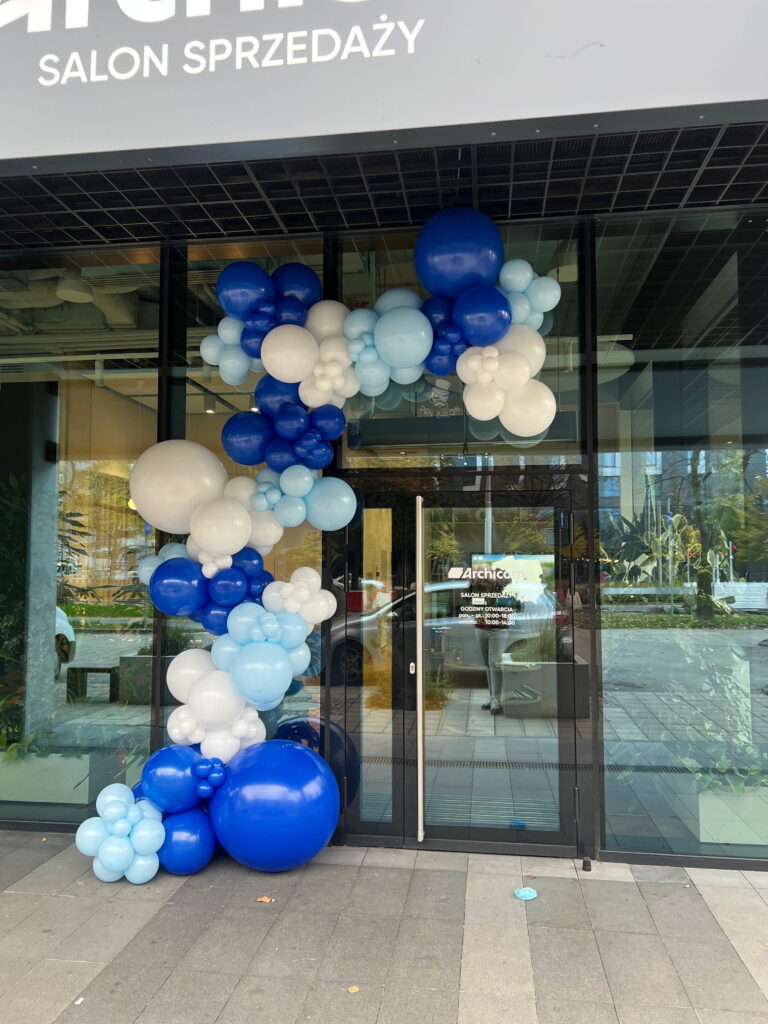 W ramach realizacji wykonaliśmy girlandę organiczną zamontowaną przy wejściu do salonu sprzedaży. Kompozycja została przygotowana z balonów w firmowych kolorach klienta – odcieniach niebieskiego i bieli – dzięki czemu dekoracja była spójna z identyfikacją wizualną marki. Tego typu girlanda balonowa jest często wykorzystywana jako dekoracja strefy wejściowej podczas wydarzeń promocyjnych, ponieważ skutecznie podkreśla wejście do lokalu i stanowi czytelny element dekoracyjny.