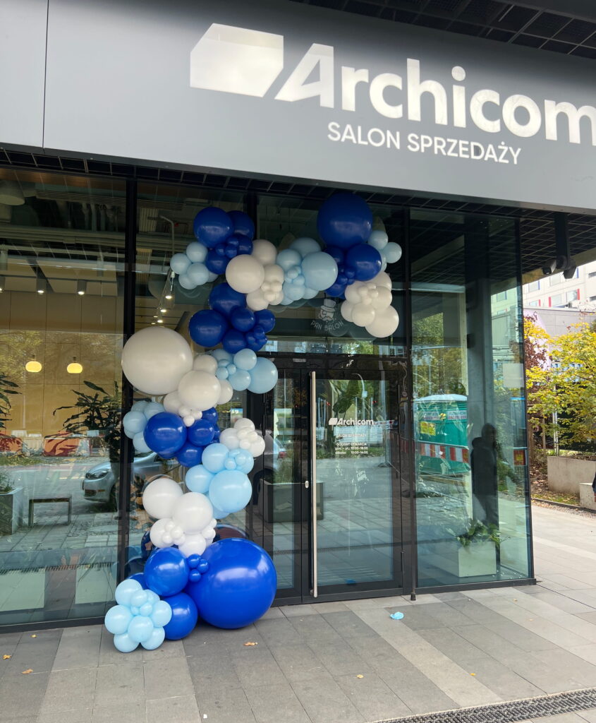 Wracamy do kolejnej realizacji przygotowanej w ramach naszej stałej współpracy z firmą Archicom. Tym razem przygotowaliśmy dekoracje balonowe w salonie sprzedaży dewelopera we Wrocławiu, które towarzyszyły akcji promocyjnej skierowanej do klientów odwiedzających biuro. W przypadku takich wydarzeń ważne jest stworzenie widocznej i spójnej oprawy wizualnej już w strefie wejściowej, która podkreśla charakter wydarzenia i przyciąga uwagę osób przechodzących obok.