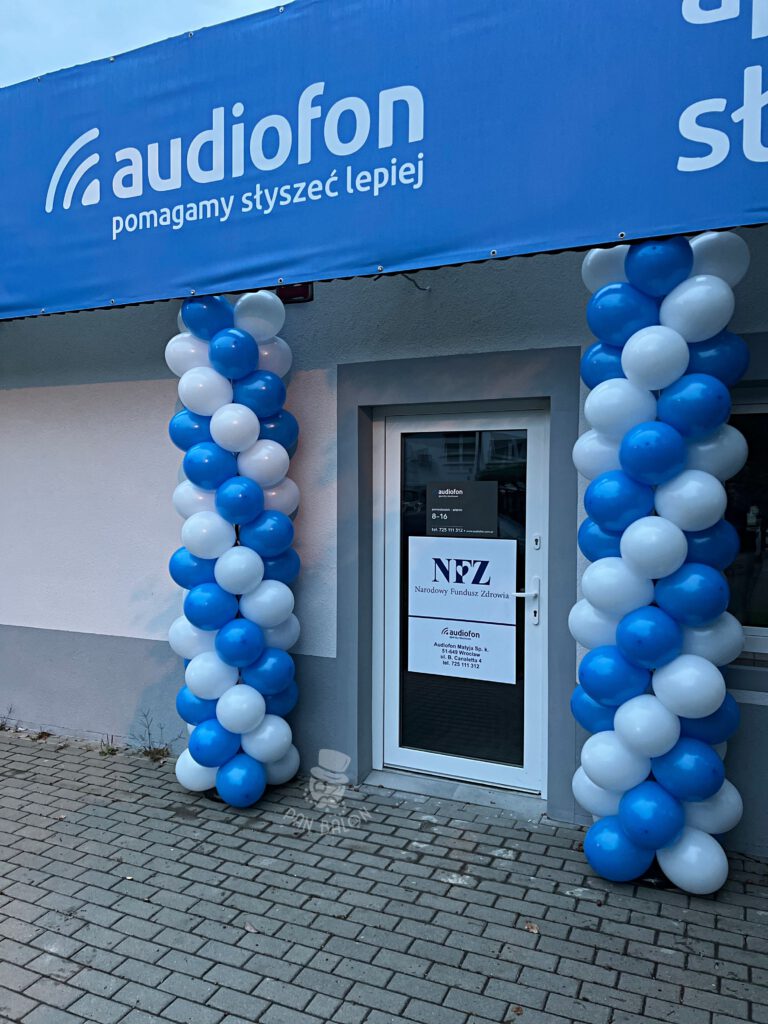 Dla klienta Audiofon wykonaliśmy dekorację balonową w formie dwóch kolumn balonowych ustawionych przy wejściu do punktu firmowego przy ul. Bernarda Belotta Canaletta 4 we Wrocławiu.