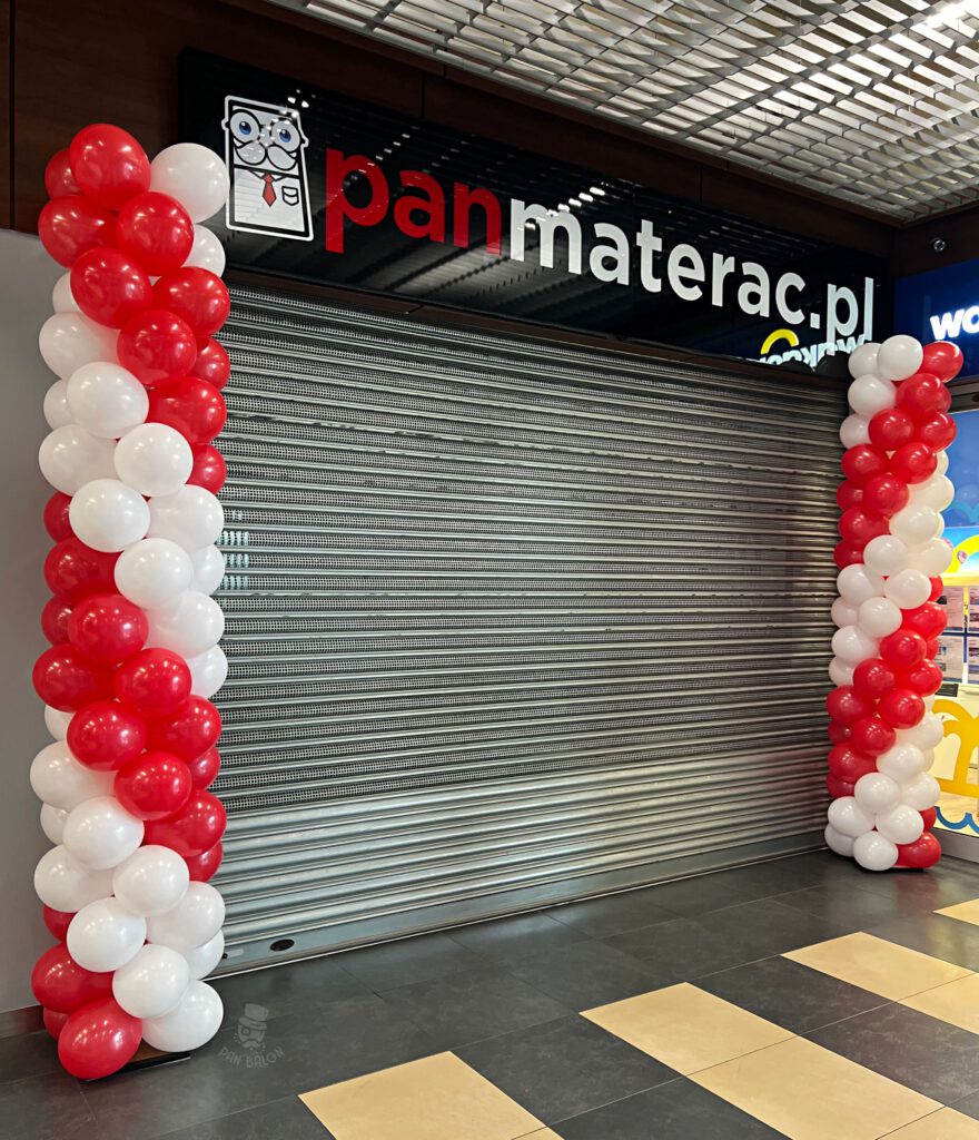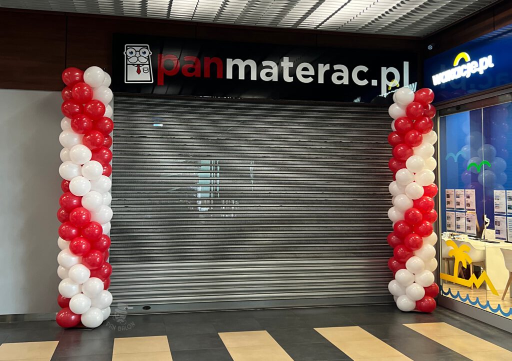 Kolumny balonowe świetnie sprawdzają się w przestrzeniach takich jak galerie handlowe, showroomy czy salony sprzedaży. W przypadku Pan Materac dekoracja została umieszczona po obu stronach wejścia.