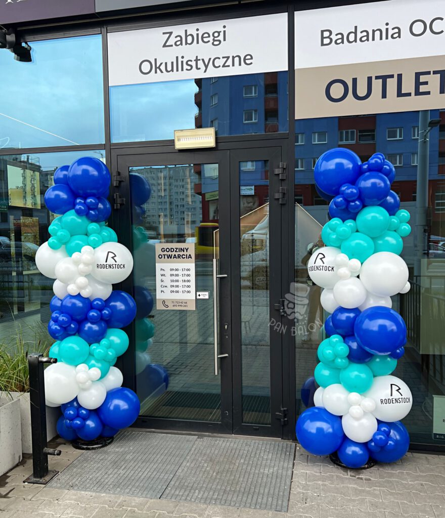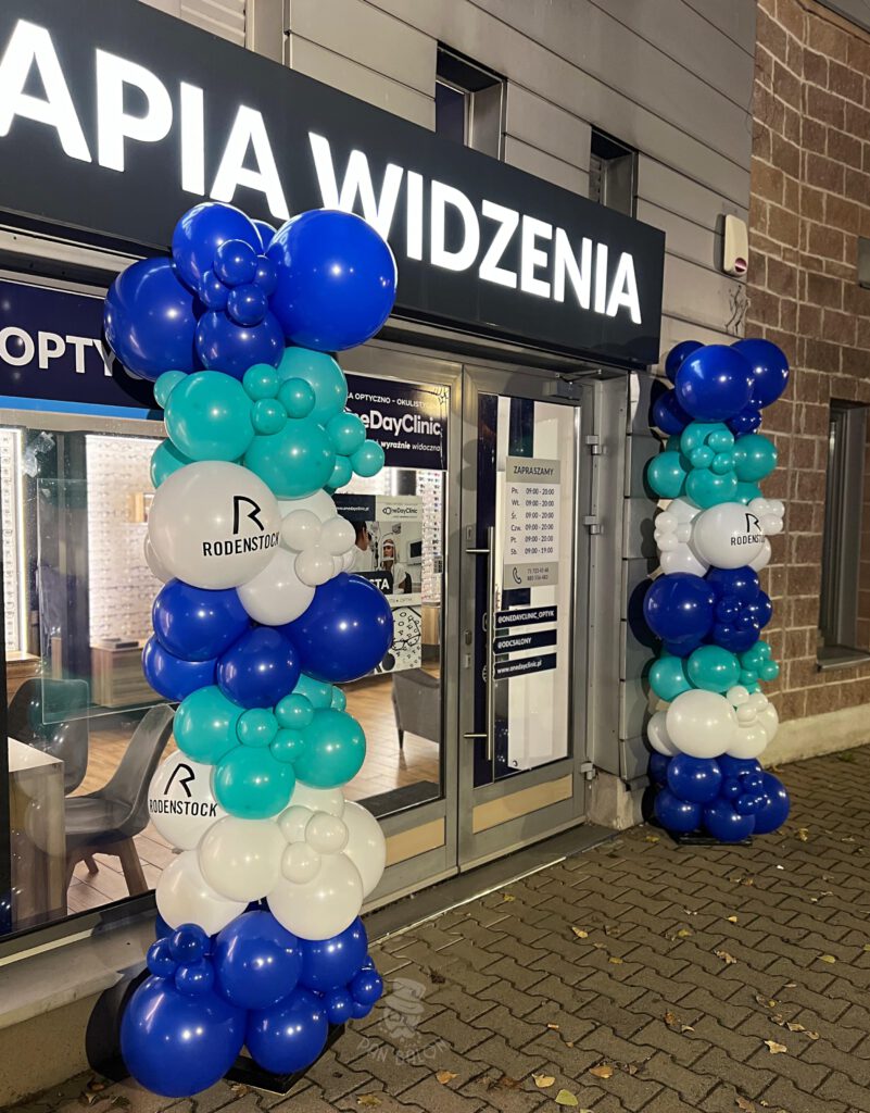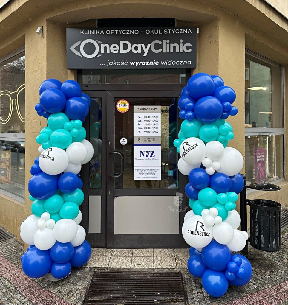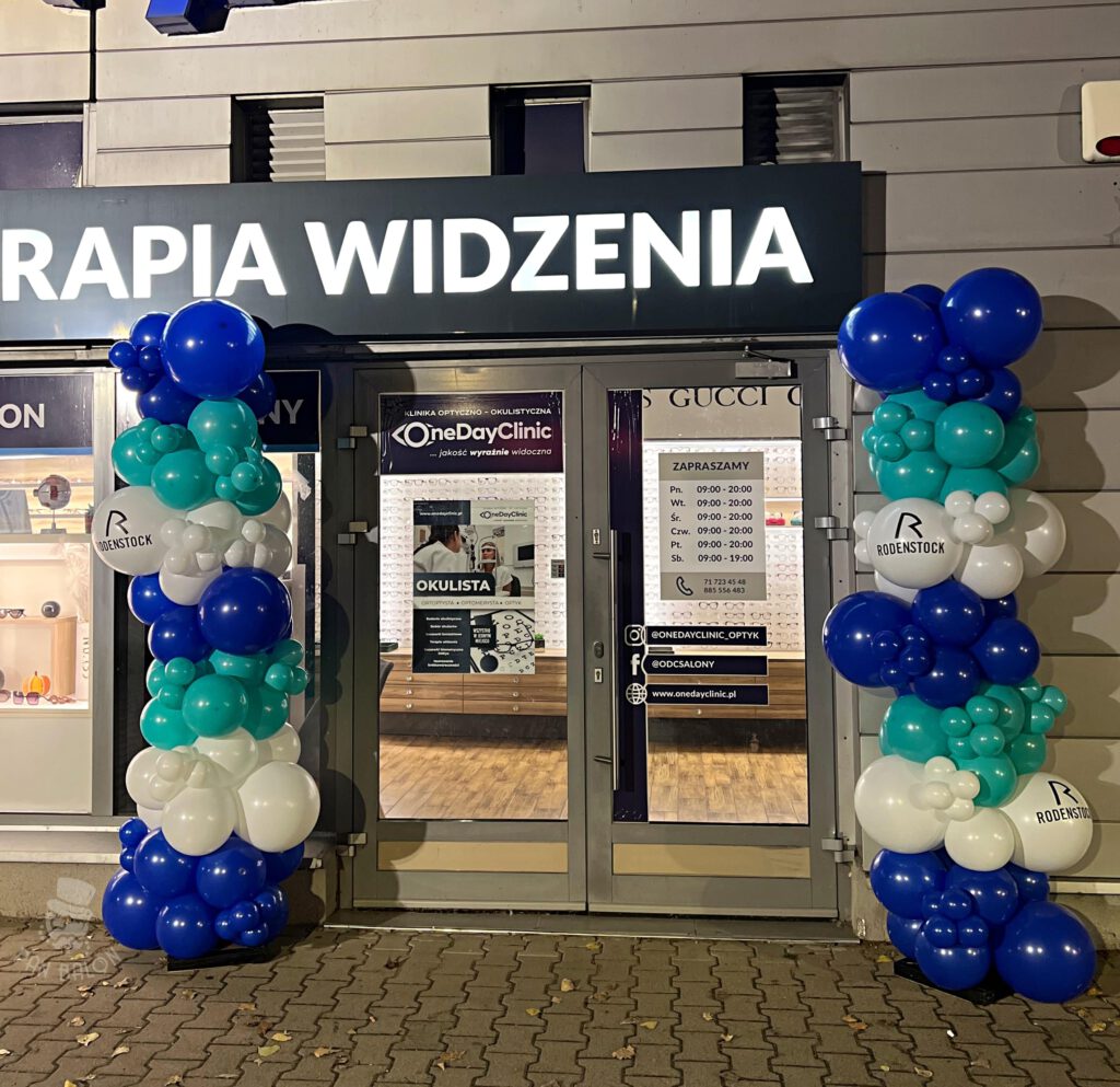 Dekoracje balonowe zostały ustawione przy wejściach do salonów, przyciągając uwagę klientów oraz podkreślając profesjonalny wizerunek marek Rodenstock i OneDayClinic.