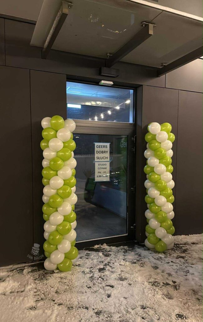 W ramach realizacji przygotowaliśmy dwie klasyczne kolumny balonowe ustawione symetrycznie przy wejściu do sklepu. Dekoracje zostały wykonane z wysokiej jakości balonów lateksowych w kolorach białym i zielonym, odpowiadających barwom firmowym klienta. Prosta, regularna forma kolumn zapewniła czytelny i estetyczny efekt, dobrze widoczny z zewnątrz lokalu. Tego rodzaju dekoracje firmowe są często wybierane przez sieci handlowe i marki usługowe, ponieważ skutecznie oznaczają miejsce wydarzenia i wspierają działania promocyjne w dniu otwarcia.