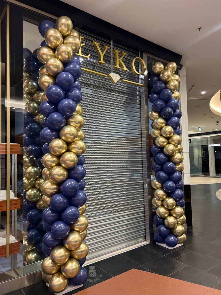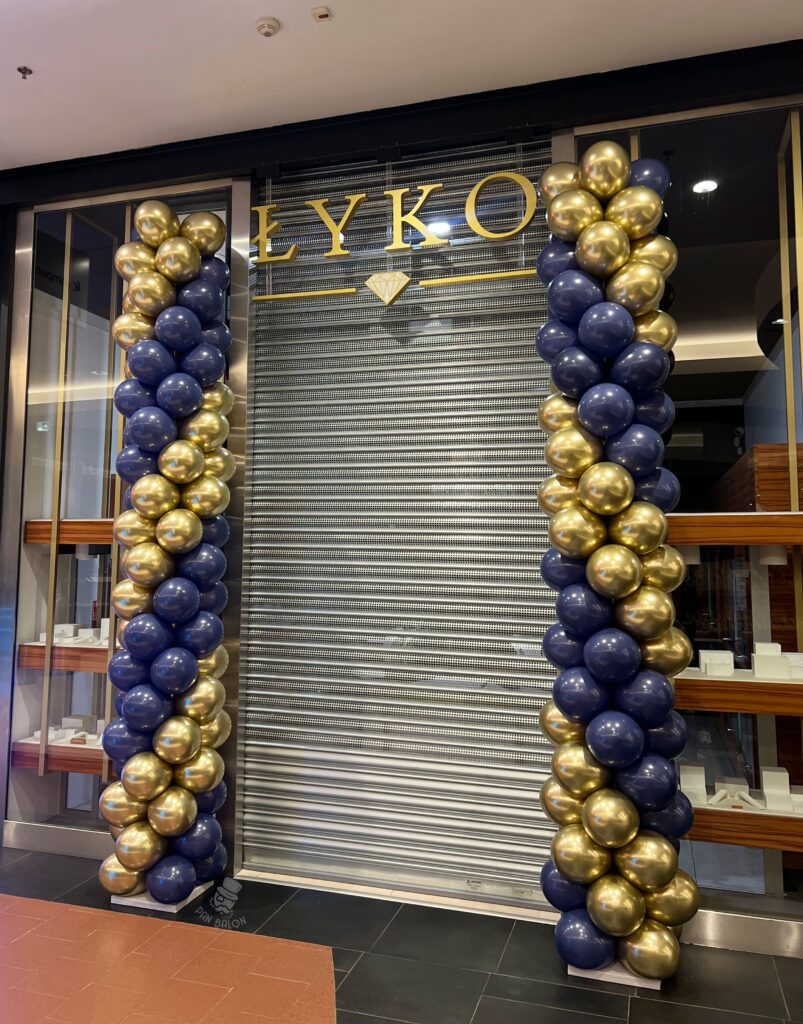 W ramach zlecenia wykonaliśmy dwie klasyczne kolumny balonowe, każda o wysokości prawie 4 metrów. Kolumny zostały ustawione symetrycznie po obu stronach wejścia do salonu jubilerskiego, tworząc spójną i wyraźną ramę wizualną. Zastosowaliśmy balony w kolorach: granatowym i złotym, które dobrze korespondują z branżą jubilerską oraz charakterem jubileuszowego wydarzenia.
