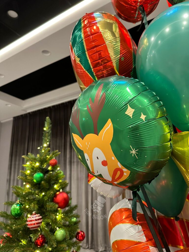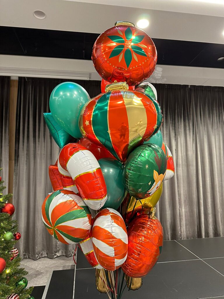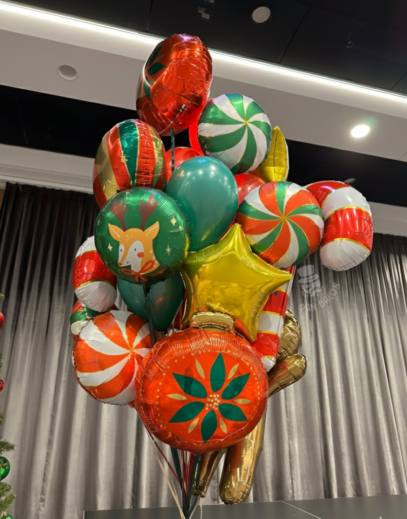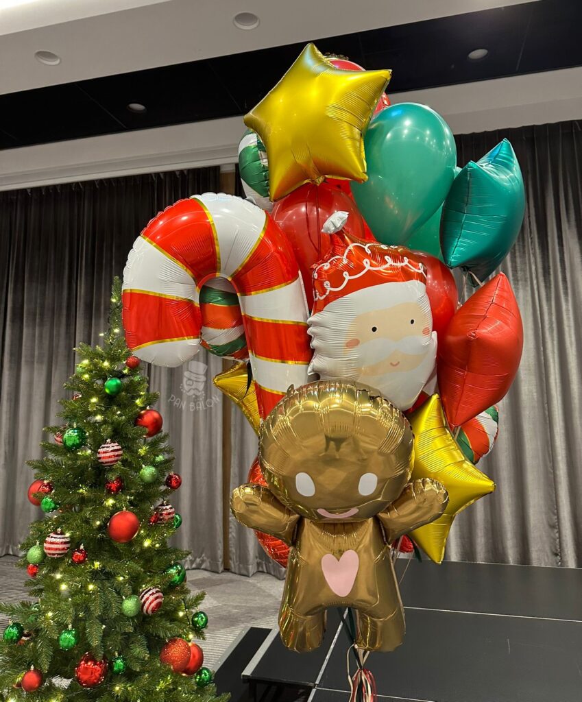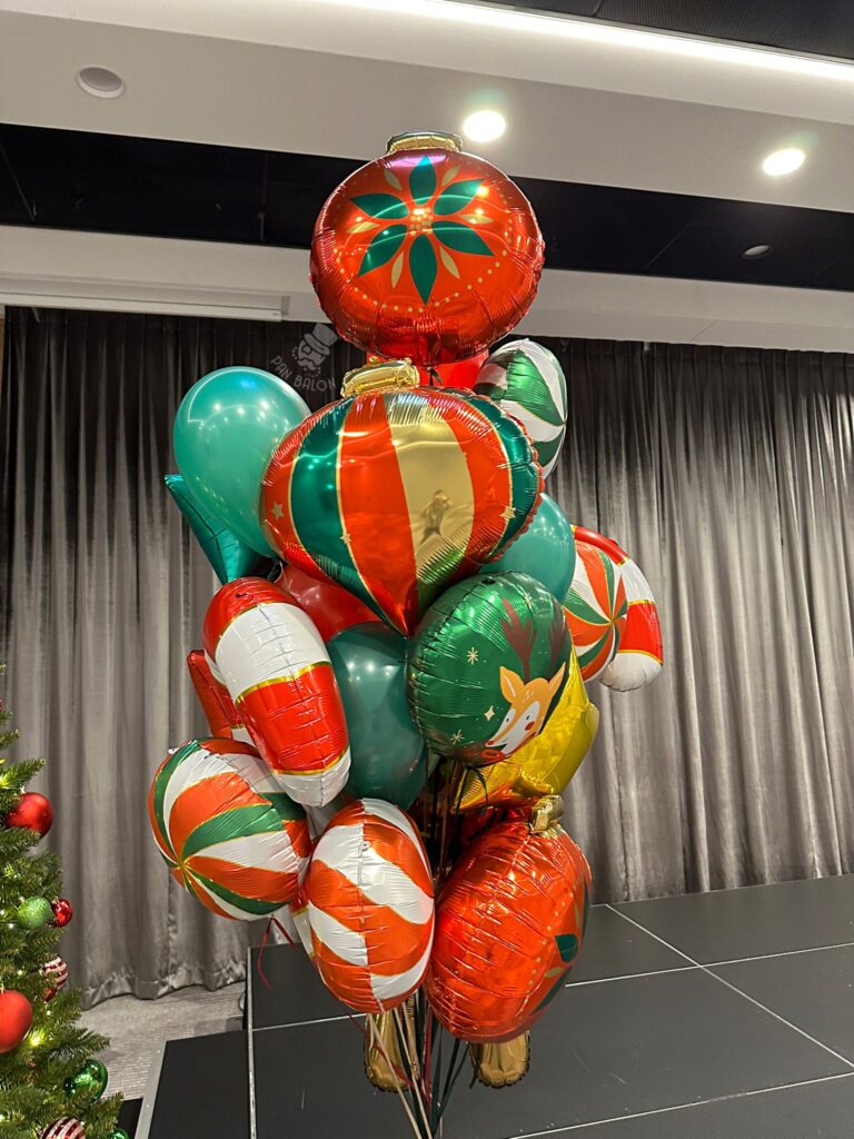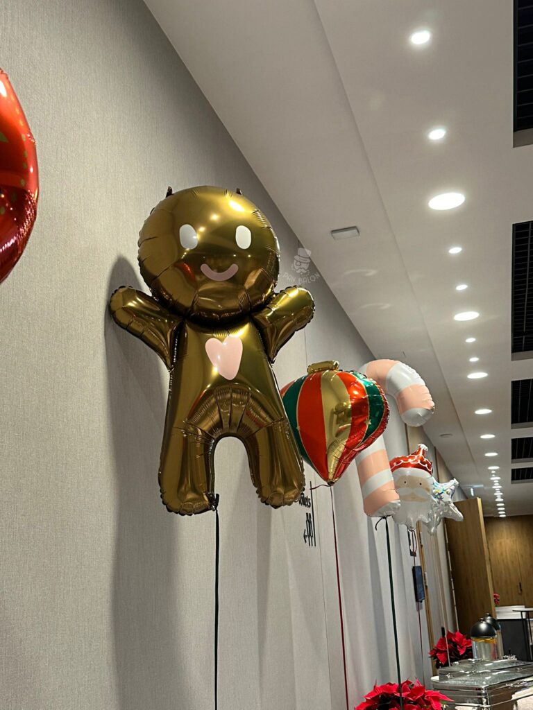 Na potrzeby wydarzenia przygotowaliśmy kilkadziesiąt świątecznych balonów z helem, które zostały rozmieszczone w przestrzeni sali eventowej oraz strefach wspólnych hotelu. Dekoracja obejmowała zarówno balony foliowe, jak i balony lateksowe, dobrane w klasycznej, świątecznej kolorystyce: dominowały czerwienie, zielenie oraz złoto. Wśród form znalazły się motywy nawiązujące do świąt – ozdobne kule, cukrowe laski, gwiazdy oraz postacie kojarzące się z zimowym okresem. Balony z helem zostały wykończone estetycznymi obciążnikami oraz satynowymi wstążkami.
