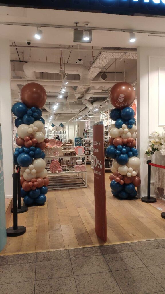 Forma kolumn organicznych sprawdziła się w przestrzeniach galerii handlowych – konstrukcje były stabilne, proporcjonalne do witryn i nie zaburzały komunikacji przy wejściu. Tego typu dekoracje eventowe to rozwiązanie często wybierane przez sieci handlowe przy okazji jubileuszy, kampanii sprzedażowych czy akcji promocyjnych. Balony do galerii muszą być odpowiednio zabezpieczone i dopasowane do warunków obiektu – zapewniamy pełną obsługę techniczną oraz profesjonalną usługę dekoratorską na każdym etapie realizacji.