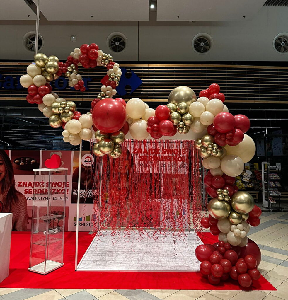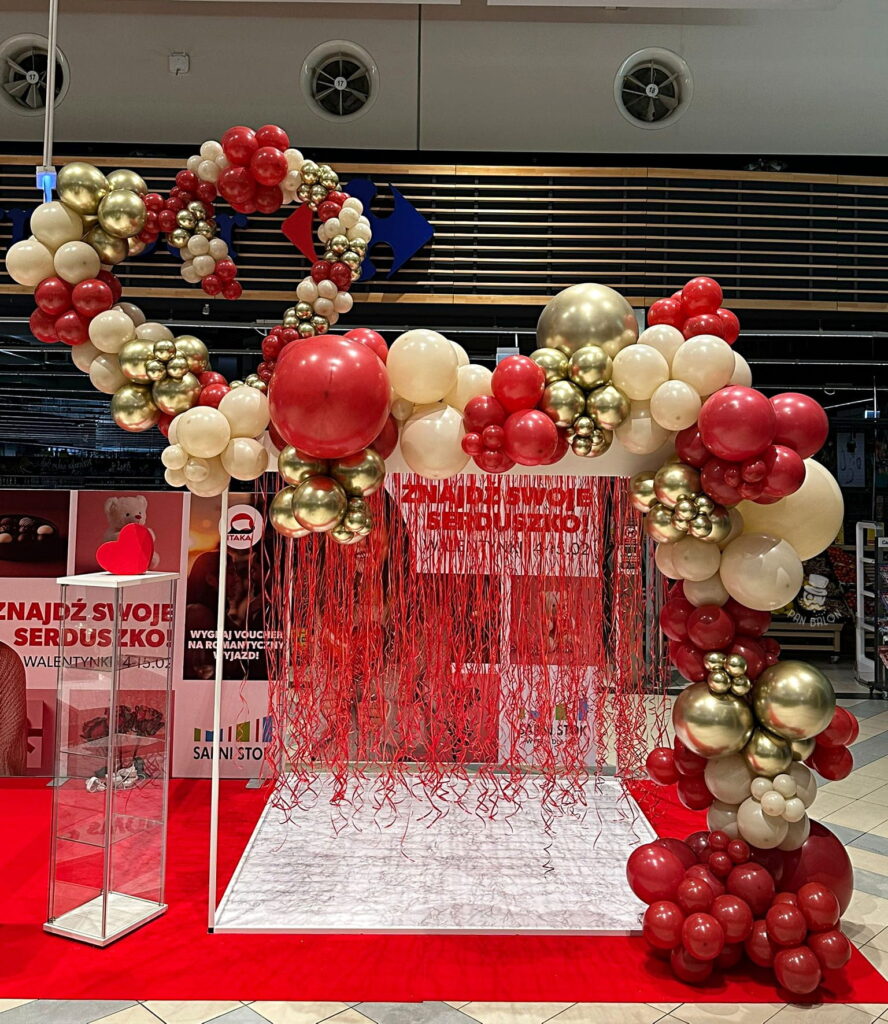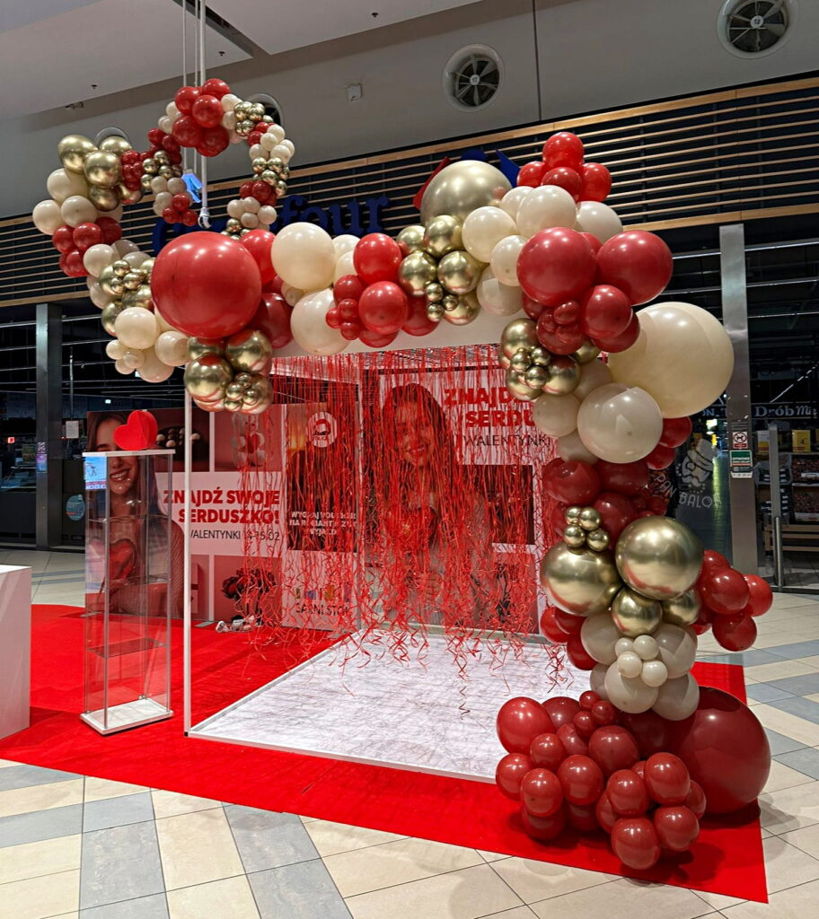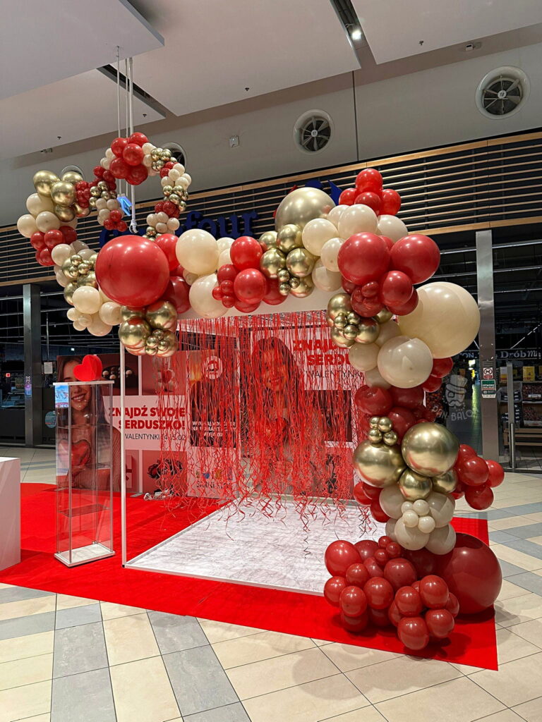 Zastosowana paleta barw obejmowała czerwień, beż oraz złoto, co pozwoliło zachować równowagę pomiędzy walentynkowym charakterem a estetyką nowoczesnej przestrzeni handlowej. W realizacji wykorzystano balony lateksowe w różnych rozmiarach, co jest charakterystyczne dla form takich jak girlanda organiczna. Tego typu dekoracje balonowe doskonale sprawdzają się w galeriach handlowych, gdzie istotna jest trwałość ekspozycji oraz jej czytelność z większej odległości. Dekoracje tego rodzaju mogą być również uzupełniane o balony z logo, balony reklamowe lub dodatkowe elementy sezonowe, w zależności od potrzeb klienta.